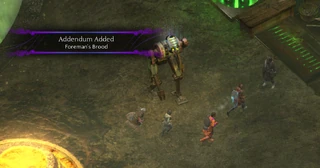 The Master Foreman has lately been thinking about ways to create constructs not from metal and synth but from organic materials - corpses, basically - and scavenged numenera. When interacted with, he talks about the purity of his pools, and the stagnation of the others. How he was haunted by the long ruin of the city, and how he dreamed of rebuilding it. The Foreman can comment on its two comrades - the Master Artisan, which has devoted itself to creating objects of finer craftsmanship, and the Crippled Foreman, which has developed an urge to procreate and is no longer part of daily labor in the manufactory.