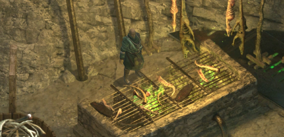 A short, solid man stands behind a smoking grill, turning pieces of meat with a pair of grimy tongs. Sweat is pouring down his grizzled face, yet he's covered head to toe in grease-spattered clothes. His sleeves are tight at the wrists and his collar pinches his neck. Nearby are three large vats that are filled with living meat, great amorphous masses of it, with appendages growing from them like the limbs of animals drowning in a meat swamp. The first vat is filled with thick, throbbing muscles, red and raw. The second is a flapping monstrosity of leathery wings, and the third sprouts hundreds of laak tails, all wiggling obscenely.